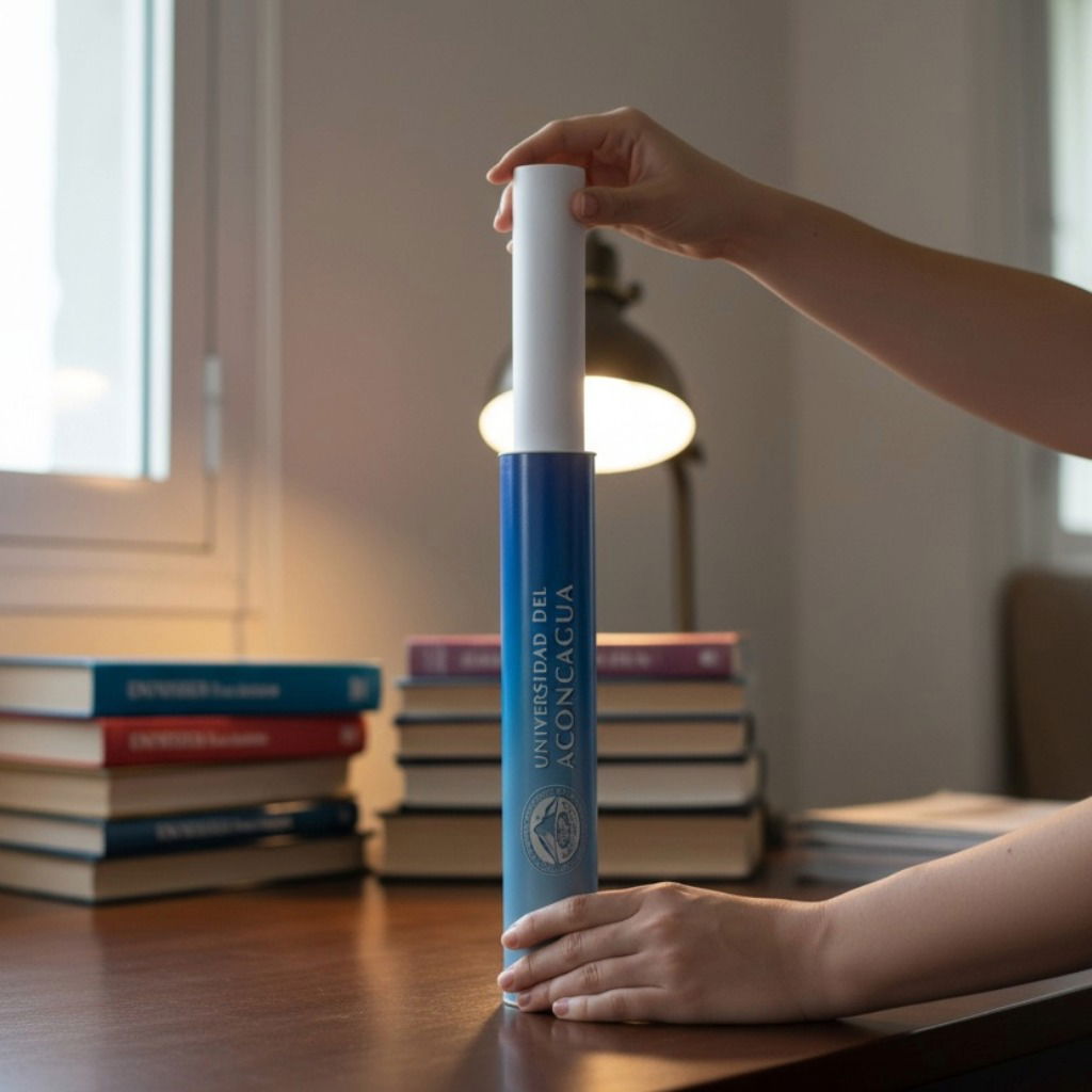 El acabado en degradé azul institucional, junto al escudo de la Universidad del Aconcagua, lo convierten en un accesorio elegante y representativo.